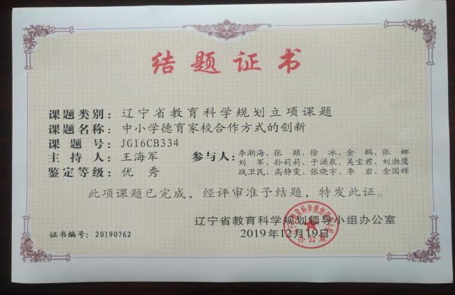 科研课题:辽宁省教育规划课题《辽宁省中小学专家型校长培养的实践研究》和《中小学德育家校合作方式的创新》在结题中被评为优秀。